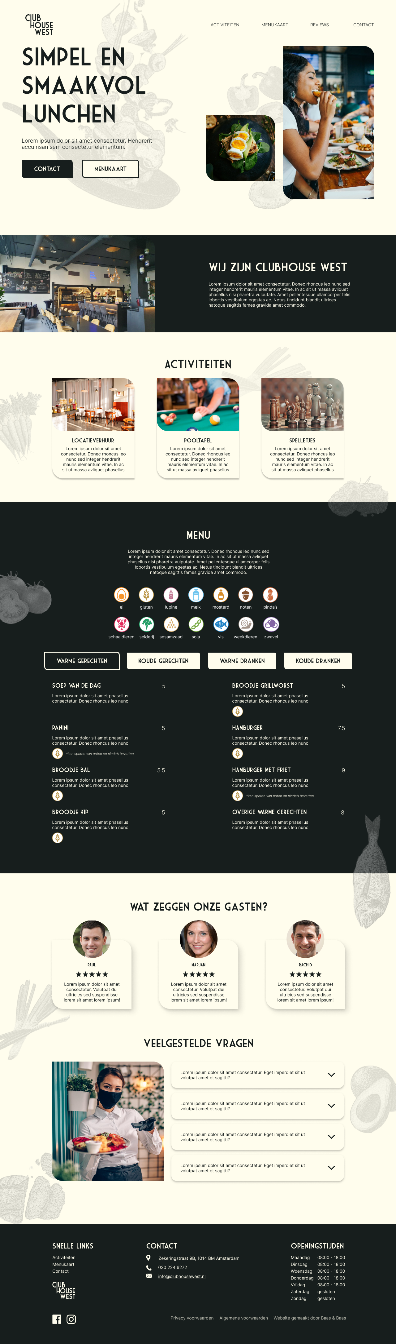 Clubhouse West is een restaurant in Amsterdam-West die een website nodig had. We wilde voor een chique stijl gaan en dit was het resultaat. Het logo van Clubhouse West, de bewerkte plaatjes in de achtergrond en icoontjes voor de allergenen en dieetwensen heb ik zelf gemaakt. De menu sectie is aanpasbaar voor de gebruiker via een invulformulier met een filter en heeft een legenda met allergenen en dieetwensen.